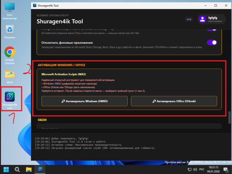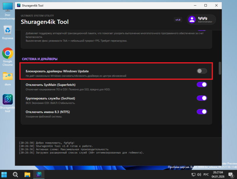 Год/Дата Выпуска: 03.02.2026 Версия: 26200.7705 Разработчик: Shuragen4ik Разрядность: 64bit Язык интерфейса: Русский Таблэтка: присутствует Системные требования: • Процессор: Не менее двух ядер с тактовой частотой не менее 1 гигагерца (ГГц) на совместимом 64-битном процессоре или Системе на кристалле (SoC). • ОЗУ: 4 ГБ и больше • Хранилище: Устройство хранения на 64 ГБ или больше • Системная прошивка: UEFI или BIOS • Графический адаптер: Графический адаптер, совместимый с DirectX 12 / WDDM 2.x. • Дисплей: > 9 дюймов с разрешением HD (720p) Описание: Легковесная и оптимизированная сборка Windows 11 25H2 для высокой производительности и приватности. Сборка основана на чистом образе с глубокими модификациями через личный плейбук ShuraOS PlayBook, unattend.xml, PowerShell-скрипты, твики реестра. Доп.Информация:Особенности:- Windows PE: Встроенная среда предустановки для удобной настройки перед установкой. - Предустановленное ПО: 7-Zip, Google Chrome, ExplorerPatcher, Shuragen4ik Tool, VLC, Picasa, DISM++ (программа с открытым исходным кодом для дополнительного применения различных настроек системы) - Удалены лишние приложения (Edge, Cortana, 3D Viewer, Clipchamp, Copilot, Recall, OneDrive, Teams и многие другие), отключены телеметрия и ненужные функции. - Производительность: Настроена для максимальной скорости (план электропитания, игровые оптимизации). - Приватность: Минимизирован сбор данных, отключены Windows Defender, SmartScreen, телеметрия, фоновые приложения. - Дополнительно: Включен Remote Desktop (только служба, саму программу можно ниже скачать в спойлере), длинные пути. Отключены UAC, быстрый запуск, гибернация, автоматические точки восстановления (если нужно, можно в ручную через команду создавать). - НЕ требует TPM 2.0, Secure Boot и обязательной учетной записи Microsoft. Shuragen4ik Tool — самописная утилита с открытым исходным кодом (WPF C#) для дальнейшей настройки системы: - Переключение схем электропитания (мгновенное применение) - Управление гибернацией, показом скрытых файлов и расширений - Игровые твики: FSO, оконная оптимизация, отключение MPO, Spectre/Meltdown, Downfall, TSX - Отключение/включение SysMain, драйверов из центра обновлений, группировка служб, NTFS 8.3 - Compact OS (сжатие системы) - Полная блокировка/разблокировка обновлений Windows (+ бесконечная пауза) - Дополнительные игровые твики: отключение Memory Integrity (HVCI), HAGS, уведомлений, высокий приоритет игр, быстрый запуск, нулевая задержка меню, фоновые приложения - Управление MSI-режимом для видеокарт и аудиоустройств (снижение задержек в играх) - Активация Windows (HWID) и Office (OHook) через MAS (Microsoft Activation Scripts) - Установка обоев из встроенной папки - Включение/выключение защитника Windows Некоторые стандартные настройки сборки (по умолчанию после установки):Активировано/Включено:- Remote Desktop (Удаленный рабочий стол) (только сама служба, саму утилиту нужно докачать в одном из спойлеров) - Длинные пути в файлах (Long Paths) - Показ скрытых файлов и расширений - Классическое контекстное меню - Проводник открывается в "Этот компьютер" - "Завершить задачу" в контекстном меню панели задач - Печать и сканирование - Общий доступ к файлам - Xbox-сервисы (в ручном режиме) - План электропитания "Ультра производительность" - Оптимизации для игр - Отключение MPO для лучшей совместимости в играх - Отключены Spectre/Meltdown/Downfall - Оптимизация для оконных игр - Нулевая задержка контекстного меню - Тёмная тема системы Отключено/Удалено: - Windows Defender (отключён по стандарту, но можно включить через Shuragen4ik Tool) - SmartScreen (везде) - Телеметр