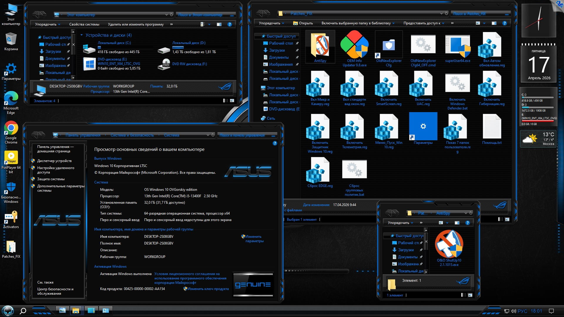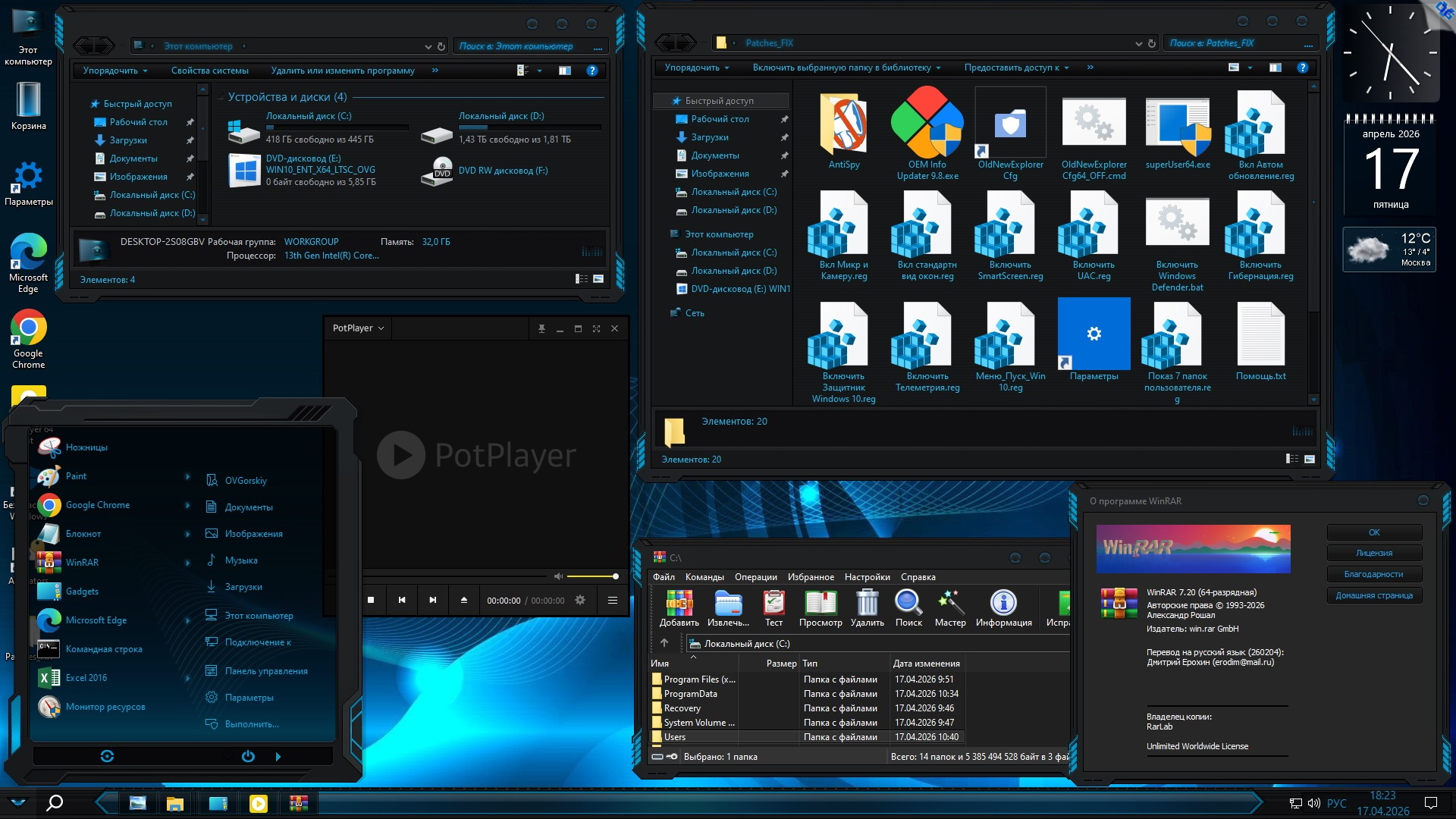 Официальный сайт: microsoft.com Язык интерфейса: Русский (Russian). Лечение: не требуется, автоматическая активация. Системные требования: Если вы хотите использовать на своём компьютере Windows 10, вам понадобится: • Процессор: Не менее 1 ГГц или SoC; • ОЗУ: 2 ГБ (рекомендуется 8 ГБ и более); • Место на жёстком диске: 25 ГБ (рекомендуется SSD 64 ГБ и более); • Видеокарта: DirectX версии 9 или выше с драйвером WDDM 1.0; • Дисплей: 800x600 точек. (Подробнее...) Описание: Сборка на основе оригинального русского образа операционной системы Windows 10 Enterprise (Корпоративная) LTSC x64 (VLSC) от Microsoft с дополнительным материалом в 1 установочном образе (x64). Установка полностью стандартная "вручную" с выбором параметров установки ОС. Интегрированы: обновления системы, небольшой набор самых необходимых программ, программа для возврата в систему привычных нам кнопки и меню "Пуск", гаджеты для рабочего стола, дополнительные темы и картинки рабочего стола, мультимедийный проигрыватель, Office 2016 и пр. Сборка предназначена для тех, кто предпочитает оформить внешний вид своей операционной системы на свой вкус и получить быструю, надёжную и почти готовую систему для работы с долговременной поддержкой. Пользователям, которые пользуются приложениями из магазина и скачивают от туда программы и игры данная версия не рекомендуется. Дополнительная информация:Название операционной системы: Microsoft® Windows® 10 Enterprise LTSC 2021 (Корпоративная с длительным сроком обслуживания).Версия ОС: 10.0 build 19044 Version 21H2 2021 (10.0.19044.7184) обновление апрель 2026г. Канал лицензирования: Volume License key [VL - Volume License]. Дата релиза: апрель 2026 г. Язык интерфейса: Русский (Russian). Разрядность: 64 бит (x64). Сборка основана на официальном образе MICROSOFT MSDN (Дата выпуска: ноябрь 2021): ru-ru_windows_10_enterprise_ltsc_2021_x64_dvd_5044a1e7.iso Интегрированы: - обновления по 14 апреля 2026 г. важные и рекомендуемые; - компонент Microsoft .NET Framework 4.8.1 Ru и накопительное обновление к нему; - дополнительные темы оформления, фоновые изображения, гаджеты, аватарки пользователя. Автоматически устанавливаемые приложения в процессе установки ОС: • StartIsBack++ 2.9.21 Final (Ru/Ml), программа для возврата в систему привычных атрибутов ОС - кнопки и меню "ПУСК" (см. примечания); • UltraUXThemePatcher 4.1.2, программа-патчер для добавления возможности применения сторонних тем оформления; • OldNewExplorer 1.1.9, программа для корректной работы сторонних тем оформления; • GadgetPack v41.0, программа для установки в систему гаджетов рабочего стола; • WinRAR v7.20, один из лучших архиваторов; • Google Chrome Corp. v147.0.7727.102, один из лучших браузеров (См. Замечания); • Microsoft Edge Ent. v147.0.3912.60, обновление браузера Edge; • Daum PotPlayer v1.7.22853, один из лучших проигрывателей (См. Замечания); • Набор библиотек Microsoft Visual C++ v14 Redistributable (x86-x64) 14.50.35719; • Компоненты Office 2016 - Word, Excel, PowerPoint и Outlook (с возможностью расширения компонентов); • Набор библиотек DirectX Jun2010 redist для старых программ и игр; • Дополнительные темы оформления, фоновые изображения, гаджеты, аватарки пользователя. При желании, все устанавливаемые программы можно удалить впоследствии из панели управления - удаление программ. Особенности и преимущества Windows 10 Enterprise LTSC.Windows 10 LTSC — это специальная редакция корпоративной линейки Windows 10 от Microsoft. Это функционально оптимизированная редакция Enterprise с долгосрочным сроком поддержки. LTSC расшифровывается как Long-Term Servicing Channel, «Канал долгосрочного обслуживания». LTSC предназначена для работы на компьютерах в